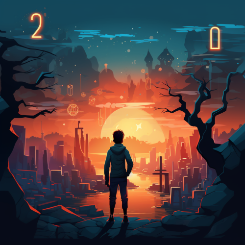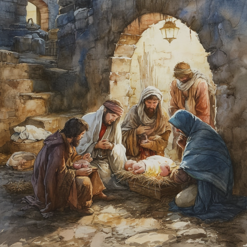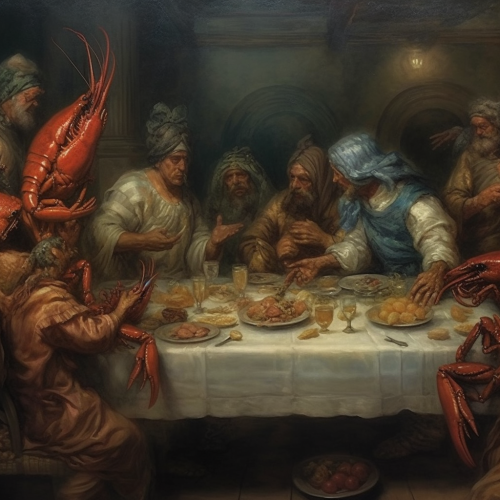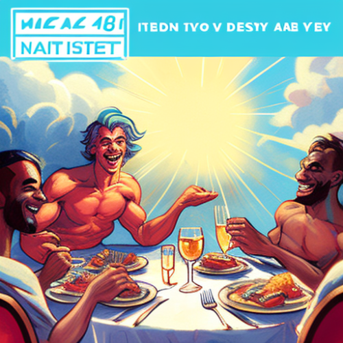 Generate an image of God and his disciples having lunch on a long table in a heavenly setting. The scene should be vibrant with celestial colors. Above them, inscribe 'Happy New Year 2024' in the sky, radiating warmth and positivity. --v 4