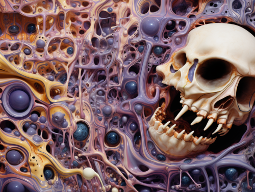 Assemblage art technique::1.3 Anila Quayyum Agha sculpture, Cecily Brown painting style, flaming globules, Chemigram technique::2.3 vibrant colours::0.7 textures, deep purple, brown, grey, yellow, dark blue, white, super detailed, intricate, An acrylic painting of the floss of taylor effused copiously from the moulten fissure --chaos 12 --ar 14:9