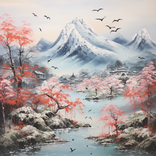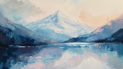 an abstract painting of a mountain scene in muted colours, mout fuji, lake, farrow and ball cornforth white, japanese influence --v 6.0 --ar 16:9