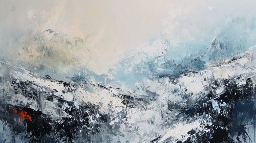 an abstract painting of a mountain scene in muted colours, cornforth white --v 6.0 --ar 16:9