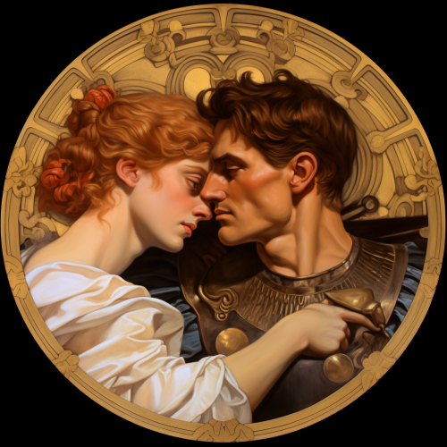 Achilles and Patroclus embracing in the exact painting style of J C Leyendecker and Norman Rockwell, J C Leyendecker art style, oil painting, visible brush strokes, textured paint, cell shading, no background, by J C Leyendecker, by Norman Rockwell