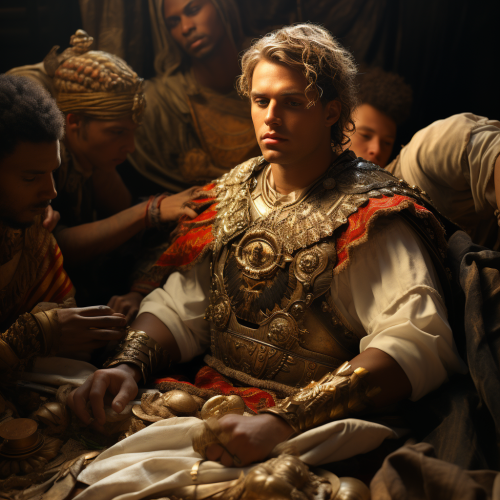 depict the once legendary alexander the great on his death bed , surrounded by multiple of his generals . hyperrealistic --s 750