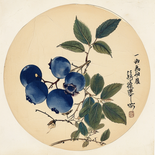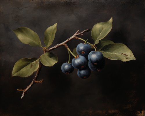 Antique oil painting, blueberry in the center of the canvas, dark background, moody, minimal still life, country aesthetic, moody neutral colors, leaves --ar 5:4