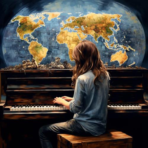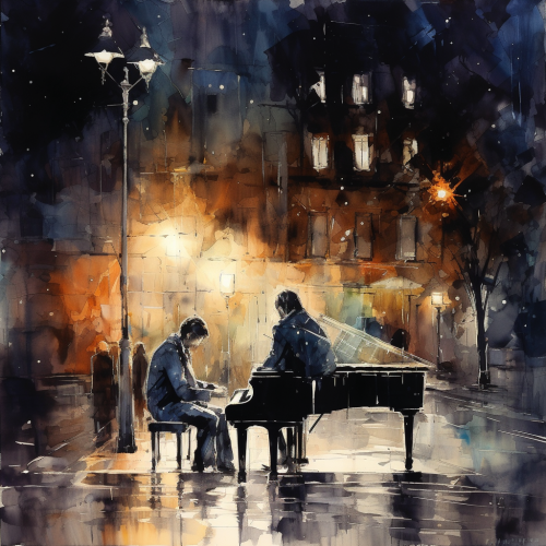 The slightly abstract modern Ink painting of lonely people playing piano under street lights vaguely hints at the Spanish street feeling of the imaginary band