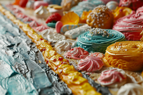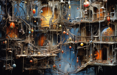 Assemblage technique, Anila Quayyum Agha sculpture, Cecily Brown painting style, Chemigram technique, vibrant colours::0.5 textures, deep purple, brown, grey, yellow, dark blue, white, super detailed, intricate, An acrylic painting of the floss of taylor effused copiously from the moulten fissure --chaos 10 --ar 12:9 --v 5.2
