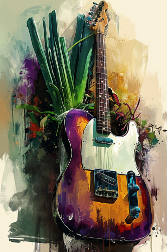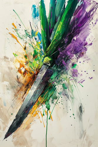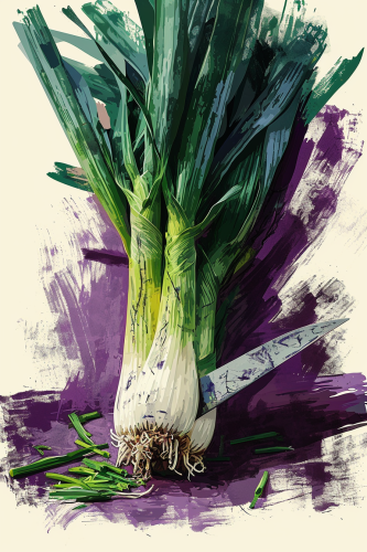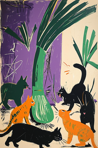 A leek being played with by cats painted by jean michel basquiat, purple, green, creamwhite background, vectorized --ar 2:3 --no splatters --s 250 --v 6.0