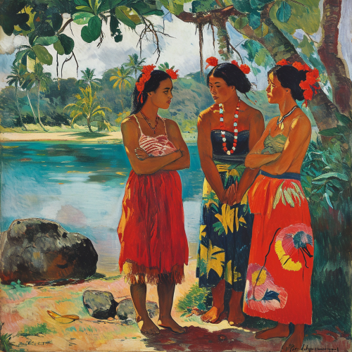Beautiful Women by the river bank, tropical paradise scenery, in the style of Paul Gauguin, --v 6.0