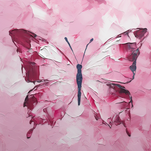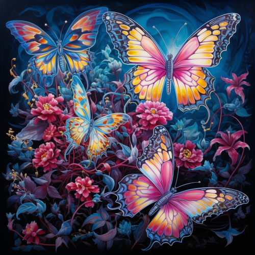 a colorful butterfly painting on the wall, in the style of vivid dreamscapes, neon art nouveau, fantasy creatures, abstraction with a touch of realism, luxurious wall hangings, illuminated visions, dark azure and pink