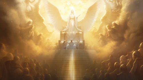 Painting style image of a bright figure sitting on a golden throne in heaven. It is a heavenly image of beautiful angels surrounding a throne and worshiping Jesus on the throne --ar 16:9 --v 5.2