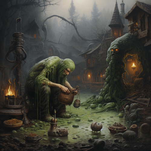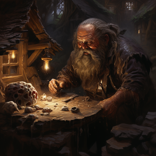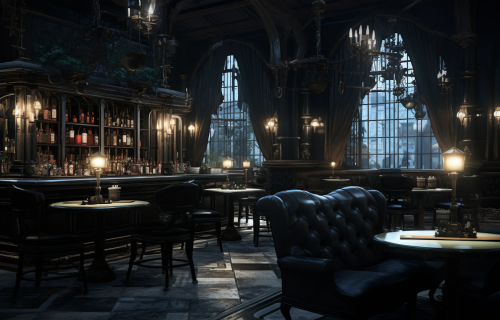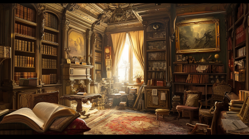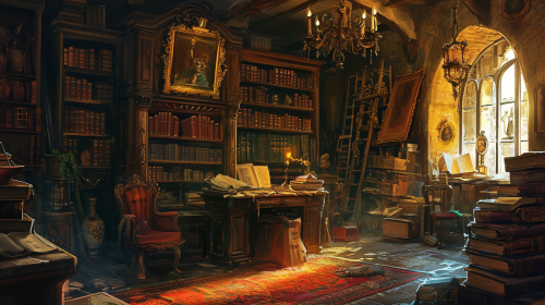 a small room packed with bookcases and parchment scrolls. Quite luxurious. Warm colors. Paintings of devils on the walls. Drawing, fantasy style --ar 16:9 --v 6.0