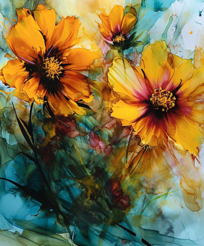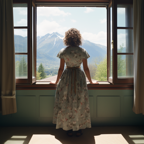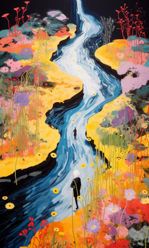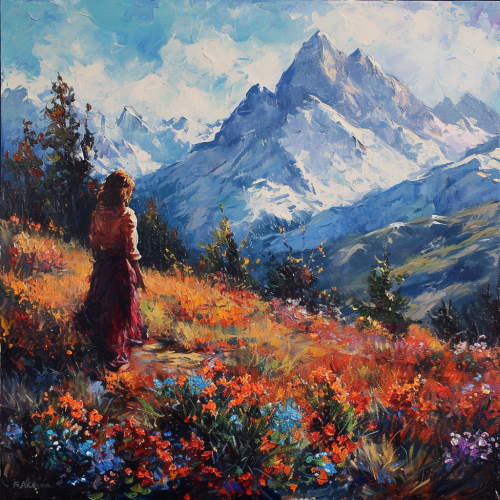 Amidst, flowers, lady finds, colors, painting, nature, bounty, mountains, snow --v 6.0 --style raw