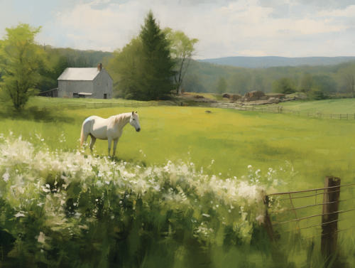 a soft and muted oil painting showing rolling green hills with white flowers in the spring and a white horse grazing, in the style of andrew wyeth, farmhouse style simple --ar 8:6 --v 5.1