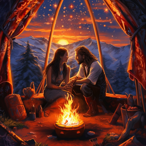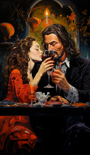 Julie Bell Painting of Couple Drinking from Chalices Cosmic Pure Harmony in the Style of Salvador Dali --ar 7:12