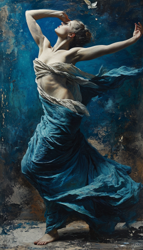 a stunning interpretation of the female form, full length shot, alluring physical features, dynamic movement, divine feminine of tragedy + grief + loss, exquisite and surreal oil painting, evocative composition, fine art, Alphonse mucha + Tomasz alen kopera + Stefan gessel, , key colors midnight blue + dark white and gray, salvador dali, diffused lighting, dramatic + cinematic scene --v 6.0 --chaos 25 --s 250 --ar 4:7