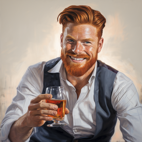 guy smiling looking friendly with red hair, reclining hairline and red beard in the style of the great gatsby, 30 years old raising his whisky sour and looking straight into the camera. oil painting style, white background