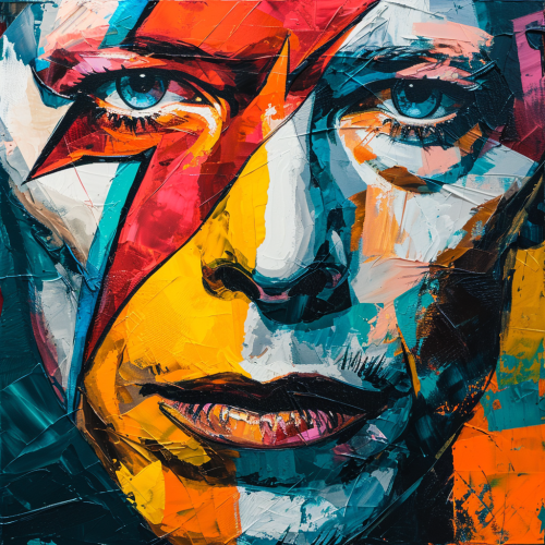 Close up of a Geometric painting of David Bowie, pixabay, neo-expressionism, west africa mask patterns style, vivid and detailed, art of alessandro pautasso and basquiat --v 6.0