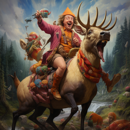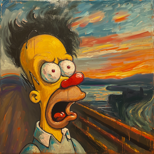 A parody of Edvard Munch’s painting The Scream but replacing the man with Krusty the Clown from the Simpsons. --v 6.0