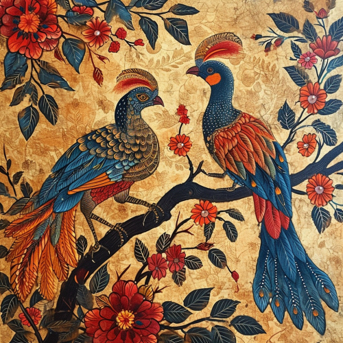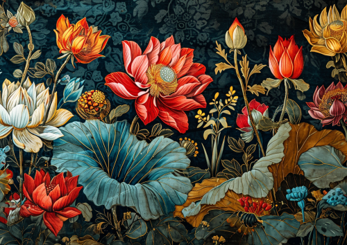 Kalamkari Painting style from India, a garden with flowers, lotus, Dalia, woven silk background, color red, green, blue, yellow, orange, very detailed, moody, ornate, --ar 7:5 --s 250 --v 6.0