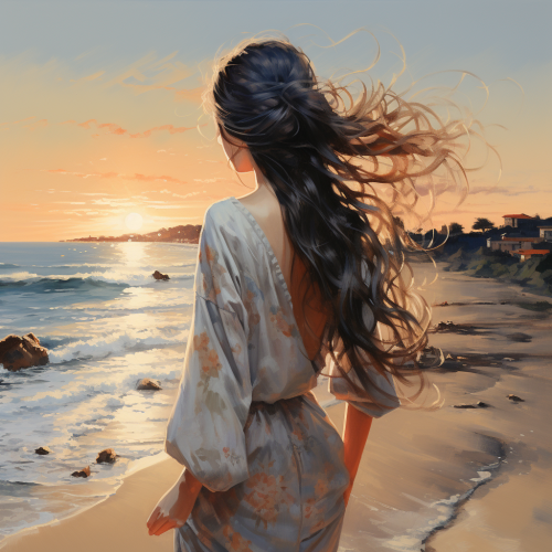 the original artist painting for the lxf book, in the style of suehiro maruo, etam cru, dynamic action painting, irene sheri, chinapunk of a beautiful long straight haired Japanese slender girl from the back looking out at the sunset of the ocean and beach