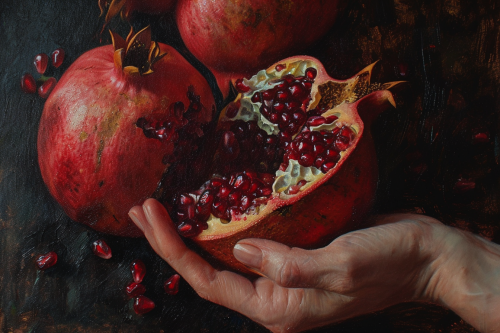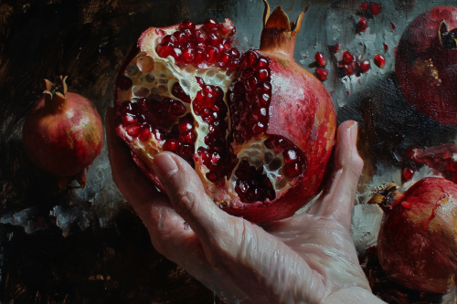 closeup of hands in a juicy pomegranate, oil painting, dark, view from above --v 6.0 --ar 3:2