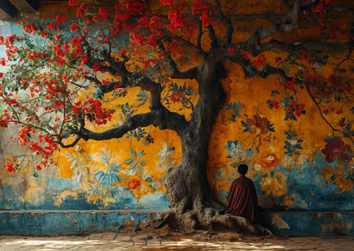 Kalamkari Painting bright colors, Banyon tree with a guru sitting under the branches --ar 7:5 --seed 666 --s 999 --v 6.0