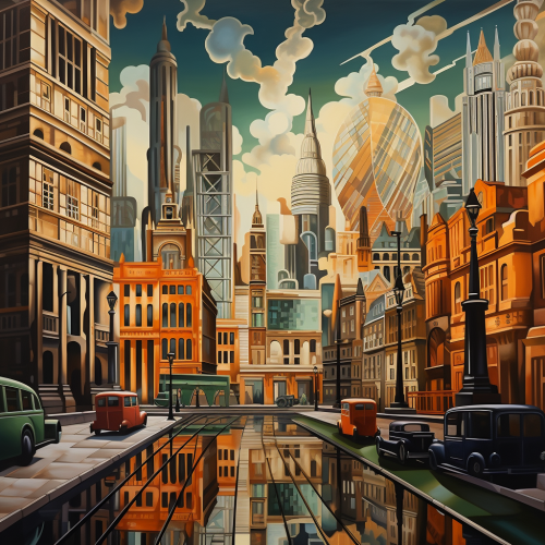 a painting of the city of London, showing main landmarks, painted in an art deco style