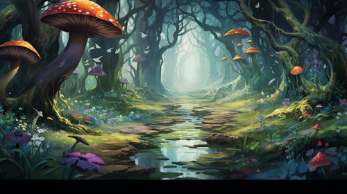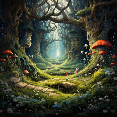 alice in wonderland-esque magic forest with royal colors, dreamy classical oil painting, totoro style, with fallen trees and moss, deep forest, wide view