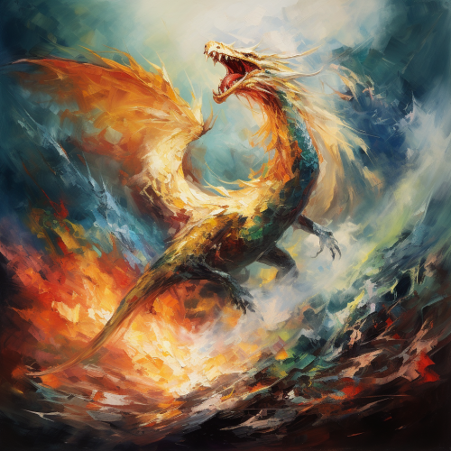 Impressionism-style painting showcasing a majestic dragon as the focal point, fluid brushstrokes and vibrant color palettes in the style of Monet or Renoir, portray the dragon in a natural atmospheric setting, dragon’s essence on light and movement, fleeting moments, wonder and mystery