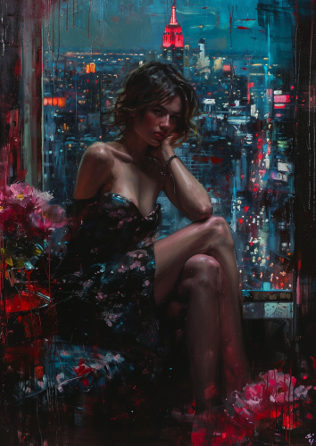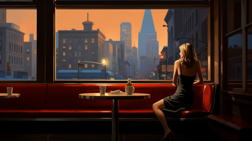a painting in the style of Edward Hopper with a modern, cybrpunk theme, set in New York. --ar 32:18 --style raw --v 5.2