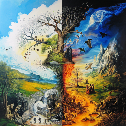 a painting with different artstyles, on the painting is no human being, it is suitable for psychotherapy practice, it should give hope and calm to the clients, pleasant lighting atmosphere, --ar 3:4