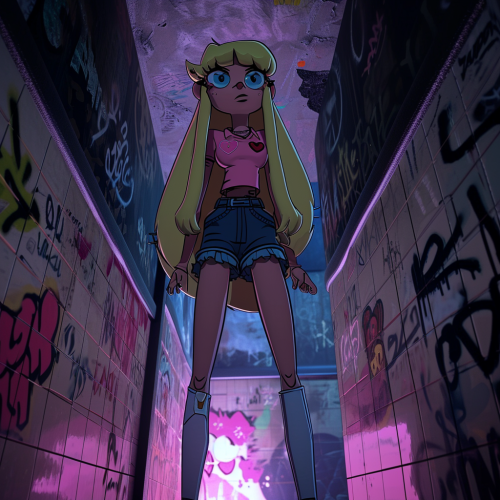 HBO animated series Star vs the Forces of Evil, animated lovingly by Daron Nefcy and the orignal team. Princess Star with her heart cheekmarks models, by American Apparel thighhighs. Filmed from the first person by the casting director in a dim cyberpunk stall looking down, graffiti on the walls. American Apparel Victoria's collection Ad. --v 6.0