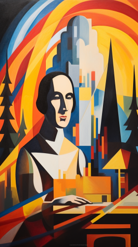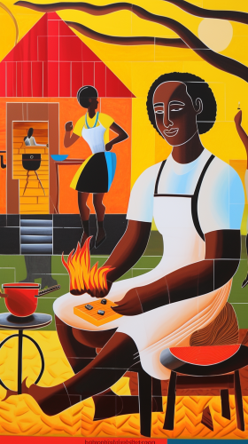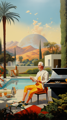 art deco abstract painting of george washington grilling in the backyard, los angeles background, backyard art deco george washington wearing shorts t-shirt and flip flops backyard party BBQ --ar 9:16 --no pool suit pants coat realistic