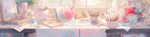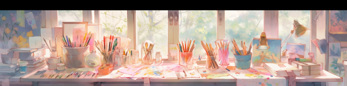 an artsy painted banner in fun pastel colors, with an open blank sketchbook displayed, books stacked on the table, and paintbrushes and colored pencils, an artist's studio, magical, i can't believe how beautiful this is --niji 5 --ar 4:1