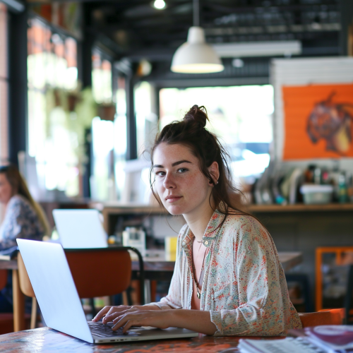 : A 26-year-old Australian woman, in a collaborative creative environment, with her laptop. She wears casual teamwork clothes, in a coworking environment...-- style raw --v 6.0