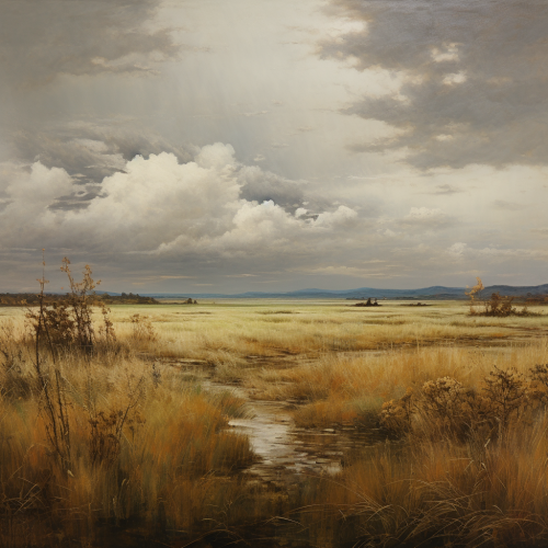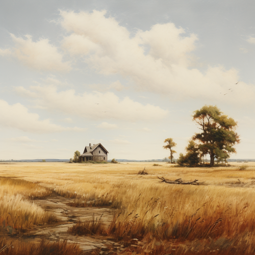 a painting shows a field with tres and grass un the style of light gray and brown, American barbizon school, panoramic scale