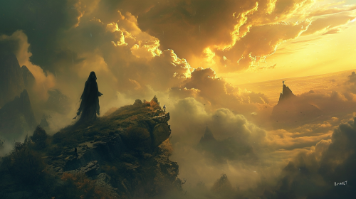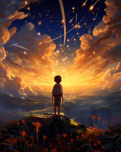 a boy standing on top of a cloud with stars under his feet, in the style of vibrant fantasy landscapes, fairy academia, golden light, intricate, delicate flower and garden paintings, bayard wu, lens flare, illustration --ar 51:64