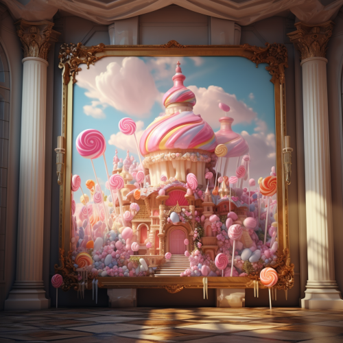 A painting hanging against the wall, inside of a candy castle, inside a luxrious castle made of candy, realistic photography, serious, 4K