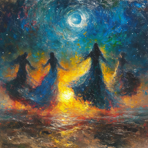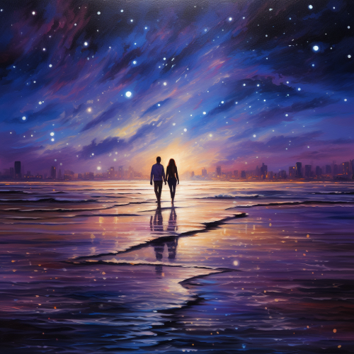 figure of man and woman on a celetial beach with stars and planets in the sky. light reflecting and refracting. blue and purple colors in the sky in the style of an oil painting