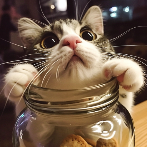 ultra cute cat caught with hand in cookie jar --v 6.0 --style raw