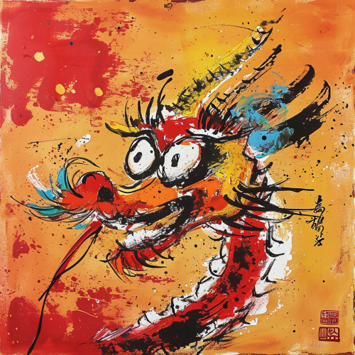 Chinese dragon painted by Wu Guanzhong, very cute dragon, close-up head, ink artistic conception, abstract simple lines, illustration, Picasso,red color, gold color,red background, 18k--ar 2:1 --v 6.0