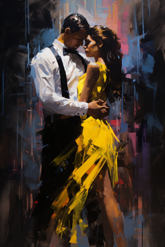 painting of dancing couple in black and yellow setting, in the style of magenta and blue, david walker, raymond leech, mottled, color splash, colorful dreams, limited palette --ar 85:128