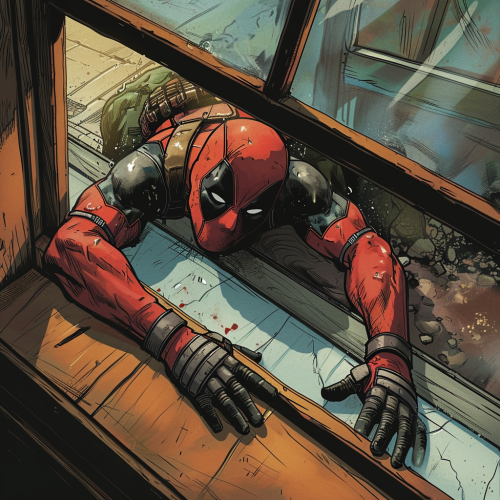 Looking out from inside the house, Deadpool is lying on the glass --v 6.0