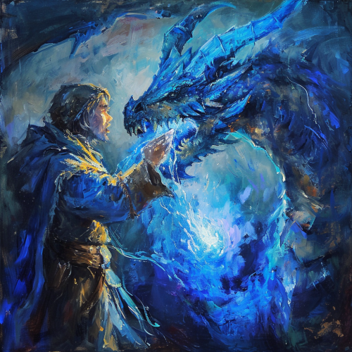 a dragonborn wizard extracting blue essence from a dragon, fantasy art, thick oil painting --v 6.0
