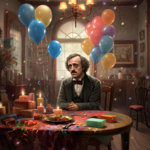 photorealistic image of edgar allen poe sitting at a table in a room filled with colorful balloons and confetti, a birthday cake with 20 lit candles is on the table in front of him, his mood is somber --v 5.0 --s 750