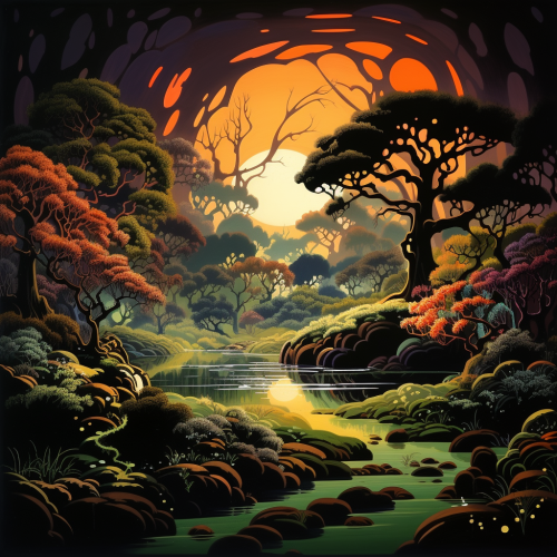Produce a fantasy landscape painting in the nostalgic style of Eyvind Earle, characterized by warm, cozy atmospheric lighting. Infuse the scene with lush landscapes and employ natural, washed-out colors, creating a retro traditional ambiance that transports viewers to a timeless, dreamlike realm