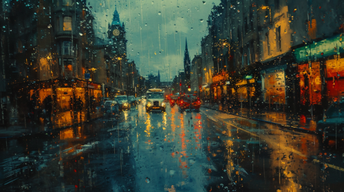 oil painting of glasgow cinematic scene, in the style of gloomy metropolises, autum night with rain contrasted by warm street lighting, 32k uhd, celestialpunk, realistic hyper detail on cinestill 800t, added film grain texture --ar 16:9 --v 6.0 --s 300