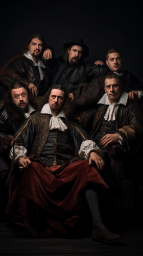 rembrandt style painting of Group of modern rich people sitting facing front , cool, Top - Down shot, hyper real, rembrandt lighting, --ar 9:16