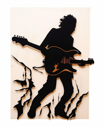 Guitarist and flash thunder print by michel j, in the style of cardboard, simplified figures, black paintings, handheld, interactive pieces, silhouette figures, arabesque/scroll --ar 100:123