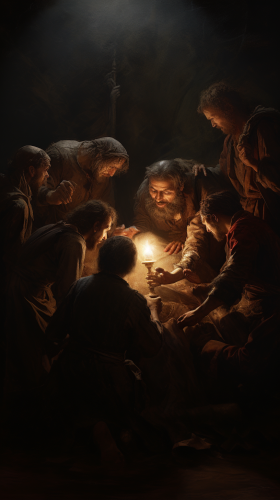 rembrandt style painting of hand helping with Group of people sitting around , mourning and distressed, modern people, Dystopian dark lit backdrop, Top - Down shot, hyper real, rembrandt lighting, --ar 9:16