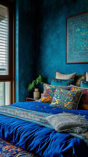 very modern Indian style inspired apartment bedroom, color palette with rich, warm tones like, blue,wall art present with Indian art forms like Madhubani or Warli painting --ar 9:16 --v 6.0